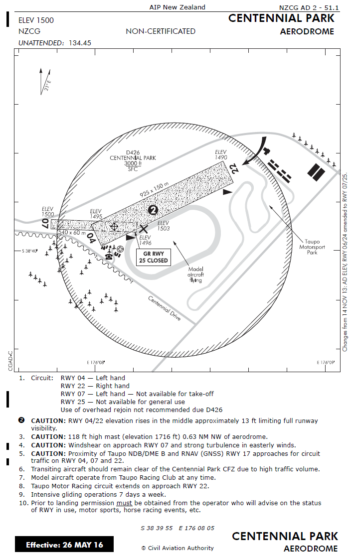 - The club operates from the Centennial Park aerodrome located north of Mount Tauhara and east of Taupō. It is an unattended and non-certified aerodrome at an approximate elevation of 1500 feet amsl. The aerodrome has a grass strip with two vectors. On the day of the accident, gliders were taking off on Runway 04 with a slight crosswind from the right and landing directly into wind on Runway 07.