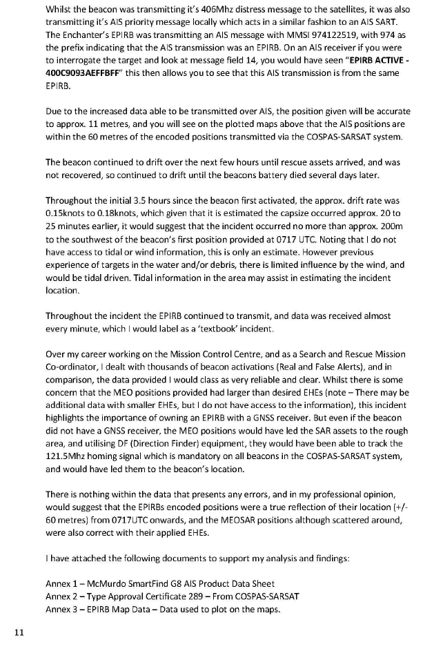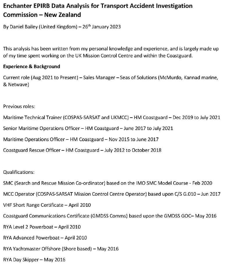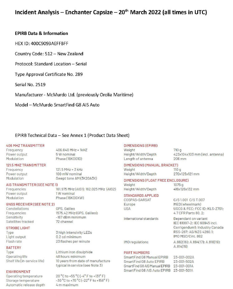 - At 2017 the New Zealand Rescue Coordination Centre (the RCC) received an initial beacon alert from the Enchanter’s EPIRB, indicating a distress off North Cape. Using the registration details for the EPIRB the RCC contacted the Enchanter’s shore base and established that the Enchanter was operating near North Cape. At about 2020 the RCC received the first encoded (see Appendix 5 for a detailed description of the data obtained from the EPIRB) transmission from the EPIRB, which included global positioning system (GPS) coordinates.