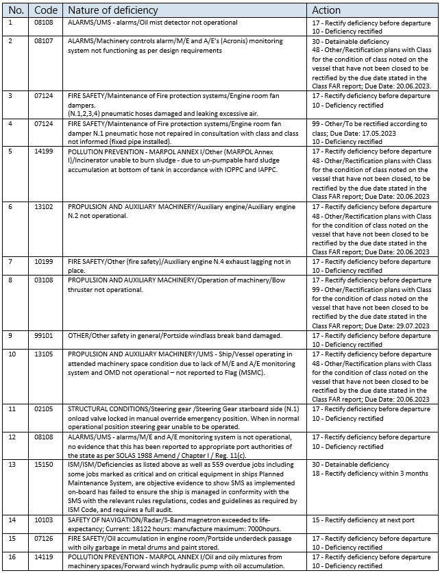 Deficiencies issued during port state control inspection on 17 April 2023.