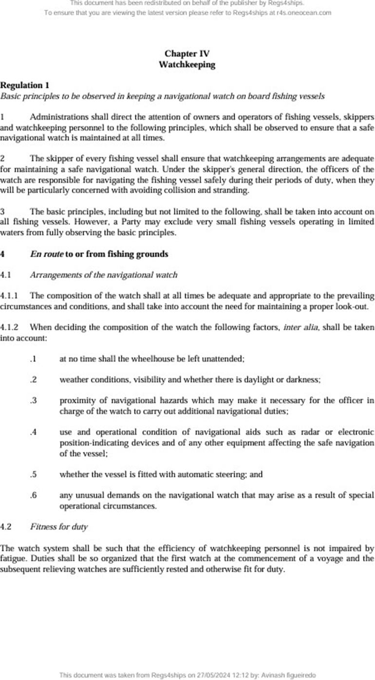 - Chapter IV of the Annex to the International Convention on Standards of Training, Certification and Watchkeeping for Fishing Vessel Personnel provides the navigational watchkeeping standards to be followed by all fishing vessels. The risk of groundings and collisions will be higher if these standards are not followed.