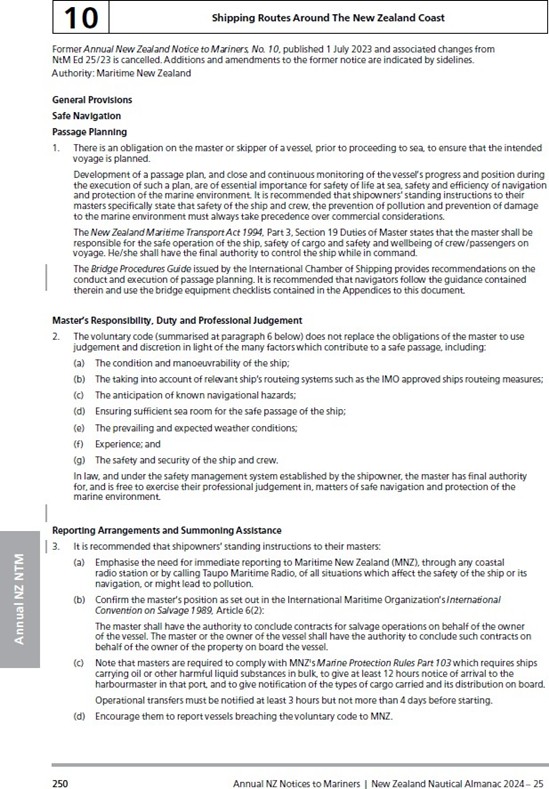 - Maritime New Zealand issues an Annual Notice to mariners (the New Zealand Nautical Almanac is published by Land Information New Zealand Toitū Te Whenua) in the New Zealand Nautical Almanac (see Appendix 1). It contains safety and navigation information, including information on the obligations of the master with respect to safe navigation and passage planning. It also contains directions for the recommended routes around New Zealand and the recommended routes into New Zealand ports.