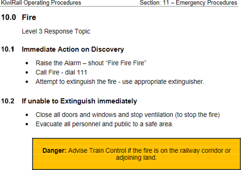 At clause 10.1 – Fire, in Section: 11 (Emergency Procedures) of KiwiRail’s Operating