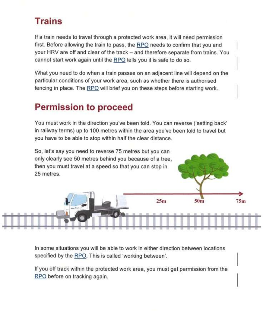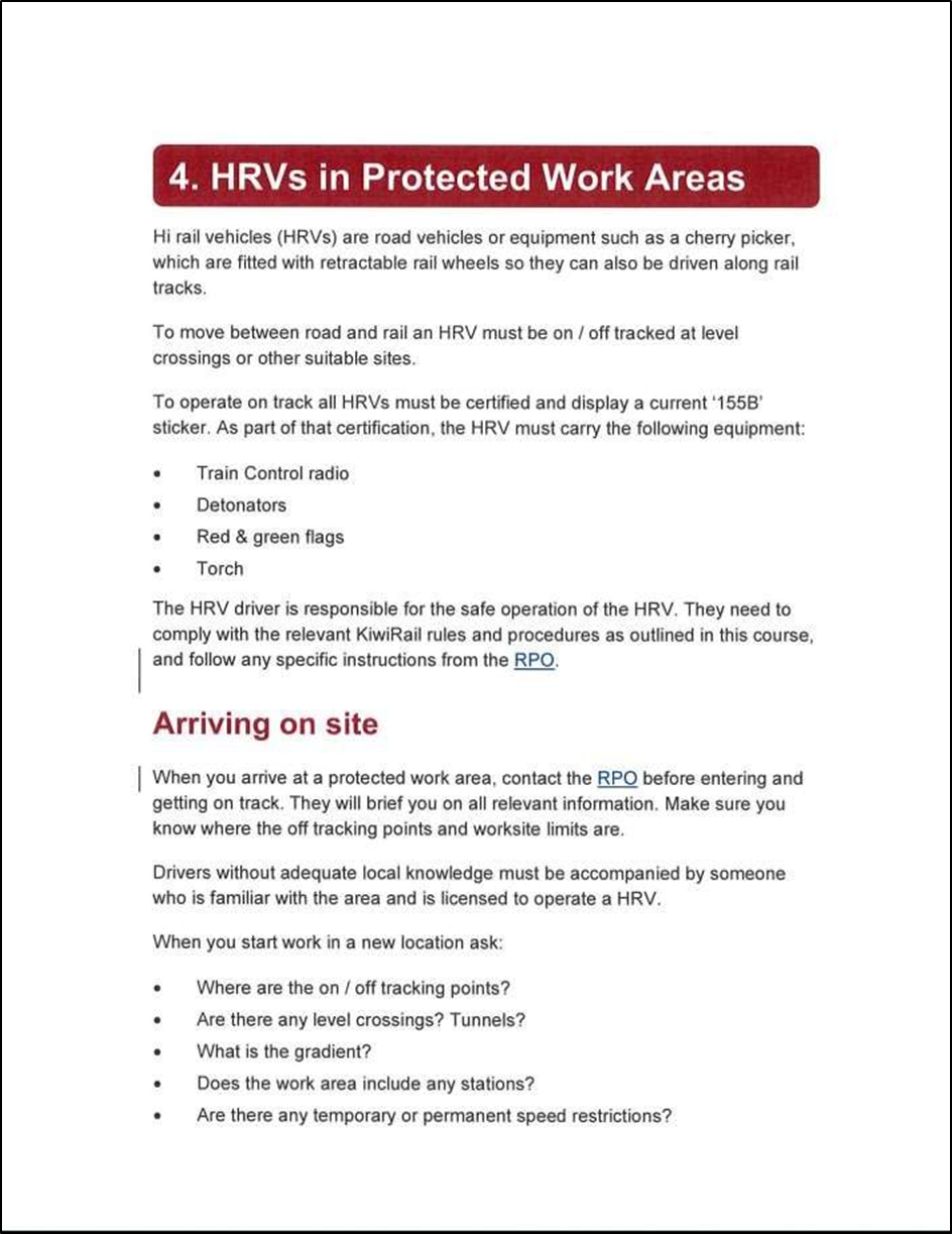Rather than being a comprehensive HRV training programme, the TPBM course was designed to give personnel operating HRVs (such as Hi-Rail diggers and other maintenance vehicles) a basic understanding of the requirements of arriving on site, on-tracking and working on-track in a protected work area under the supervision of a RPO. This basic course was considered necessary as some operators, such as non-KiwiRail contractors, may not have been familiar with KiwiRail’s HRV safety requirements. The TPBM workbook stated in part: