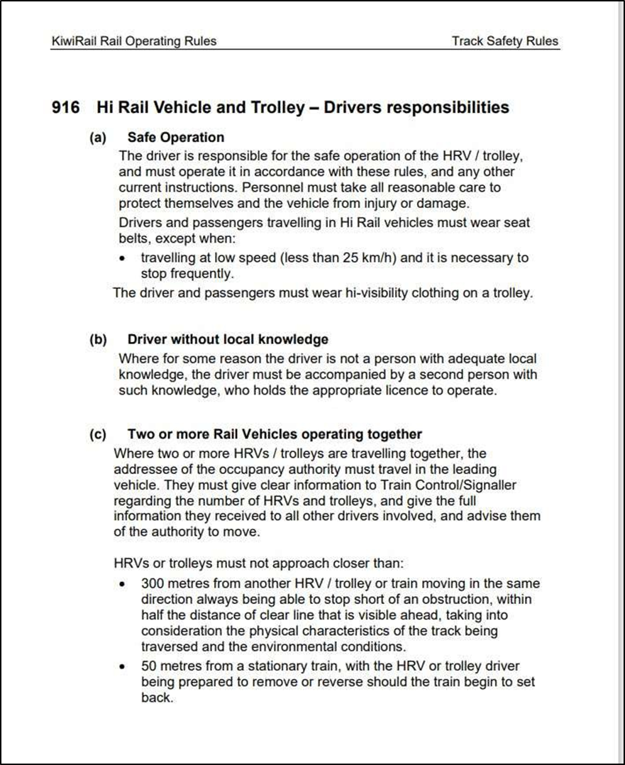 Appendix 3. KiwiRail Rail Operating Rule 916 Hi Rail Vehicle and Trolley – Drivers responsibilities