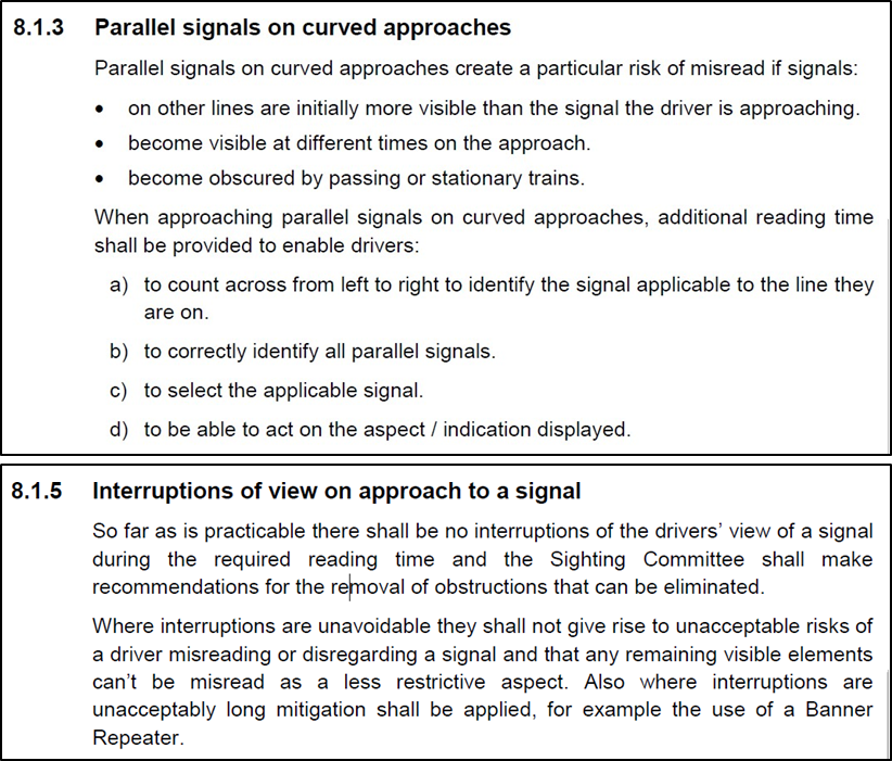 - Parallel signals on curved approaches pose a particular risk of being ‘misread’ if signals on other lines are initially more visible and the signals become visible at different times.