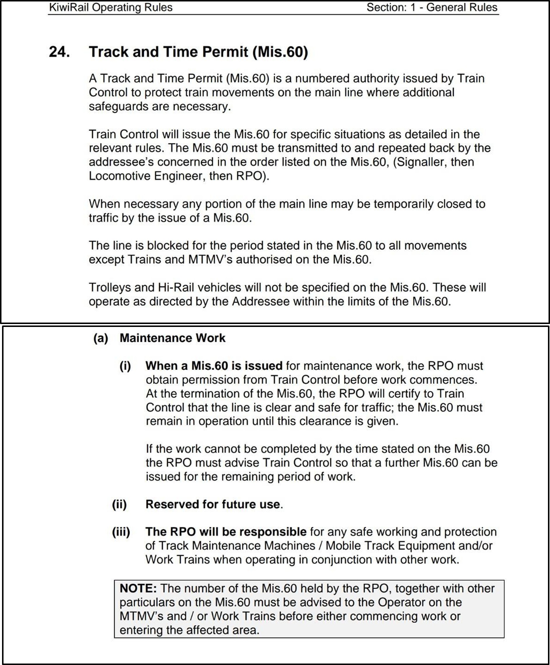 - The RNR project involved multiple worksites, and entry to the project area was protected by a ‘track and time permit’ issued by train control. The permit was known as a Mis.60 (see Appendix 1).