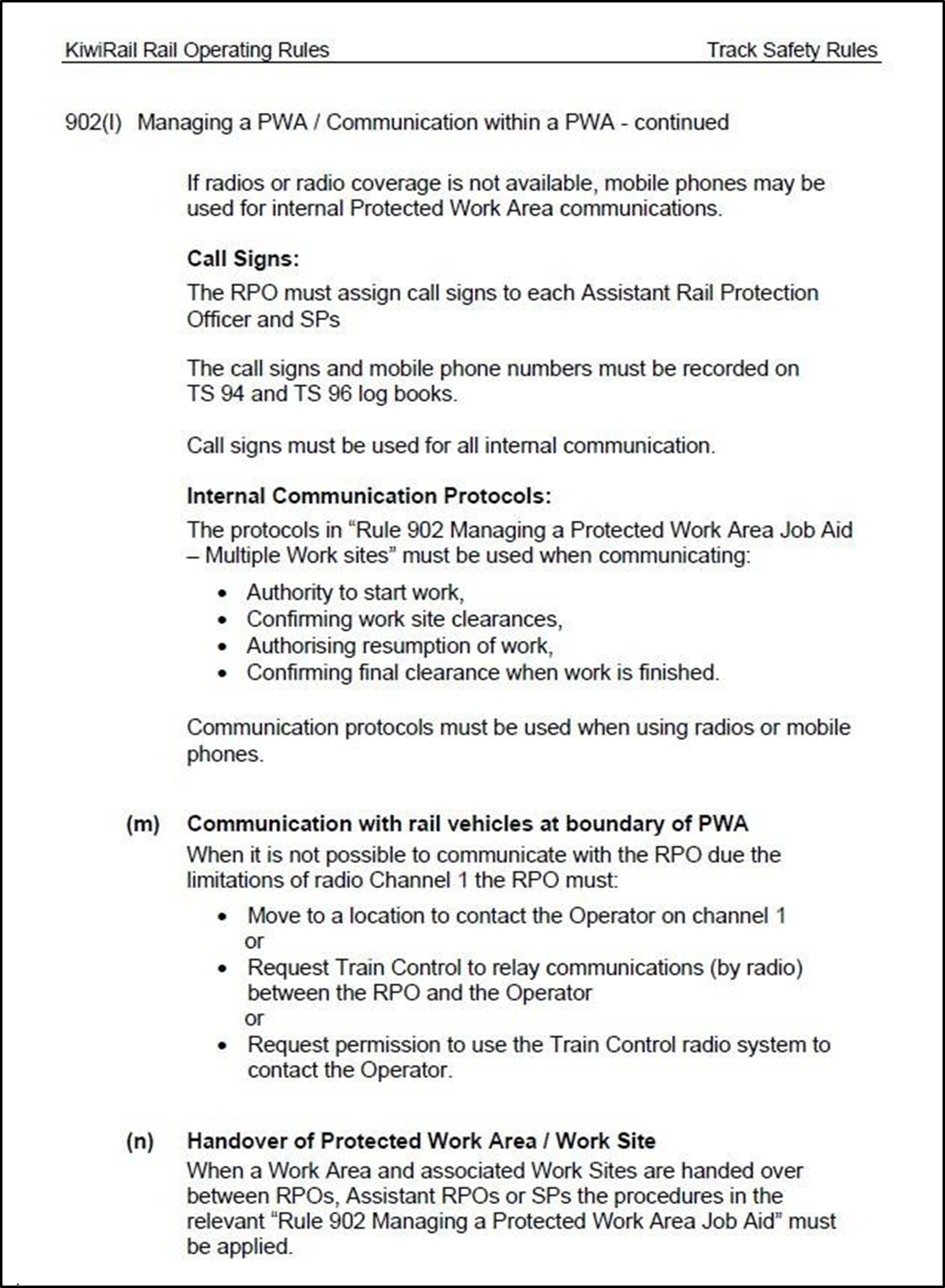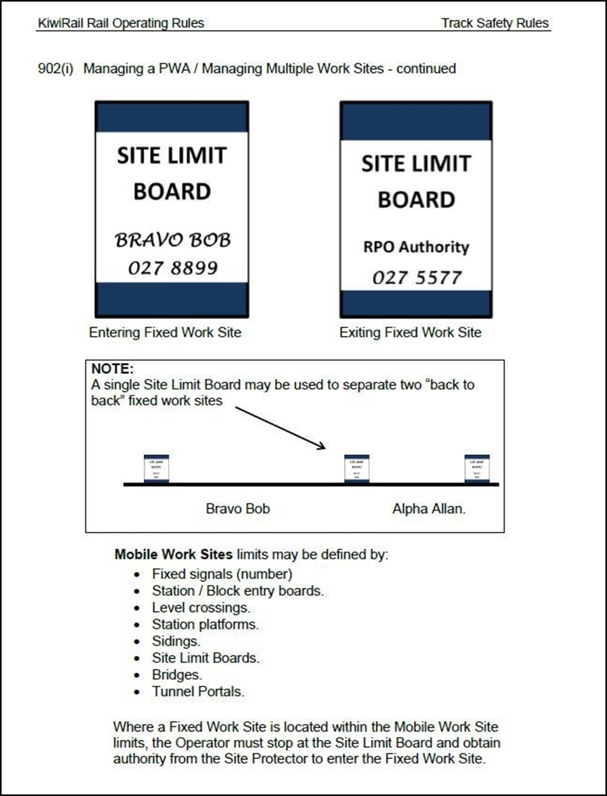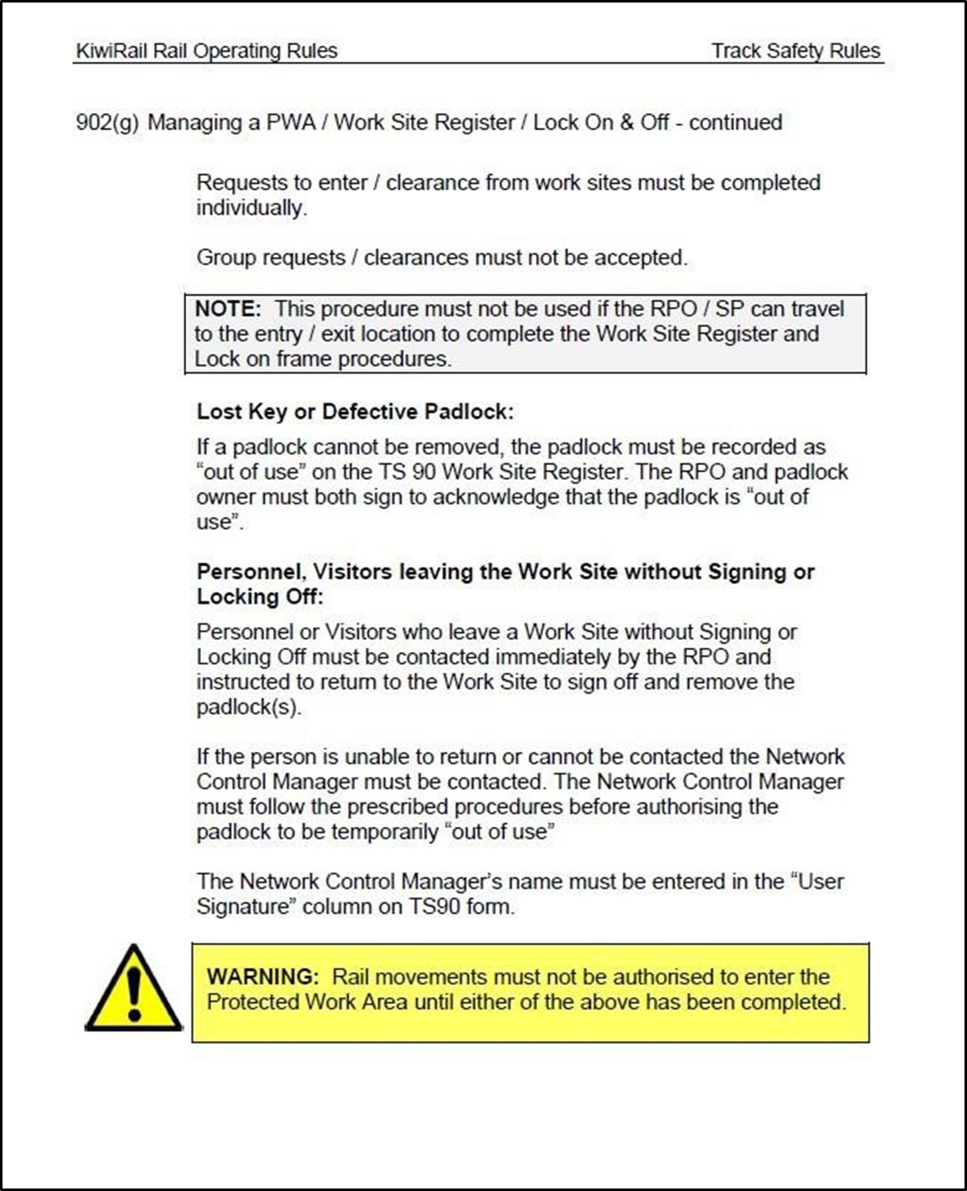 - Individual worksites within the Mis.60 area were required to operate under the guidelines of KiwiRail’s Rail Operations Rules and Procedures Rule 902 – Managing a Protected Work Area (PWA). Rule 902 protection included a requirement that each worker lock on to the worksite by using the frame and padlock system (see Figure 7 and Appendix 4).