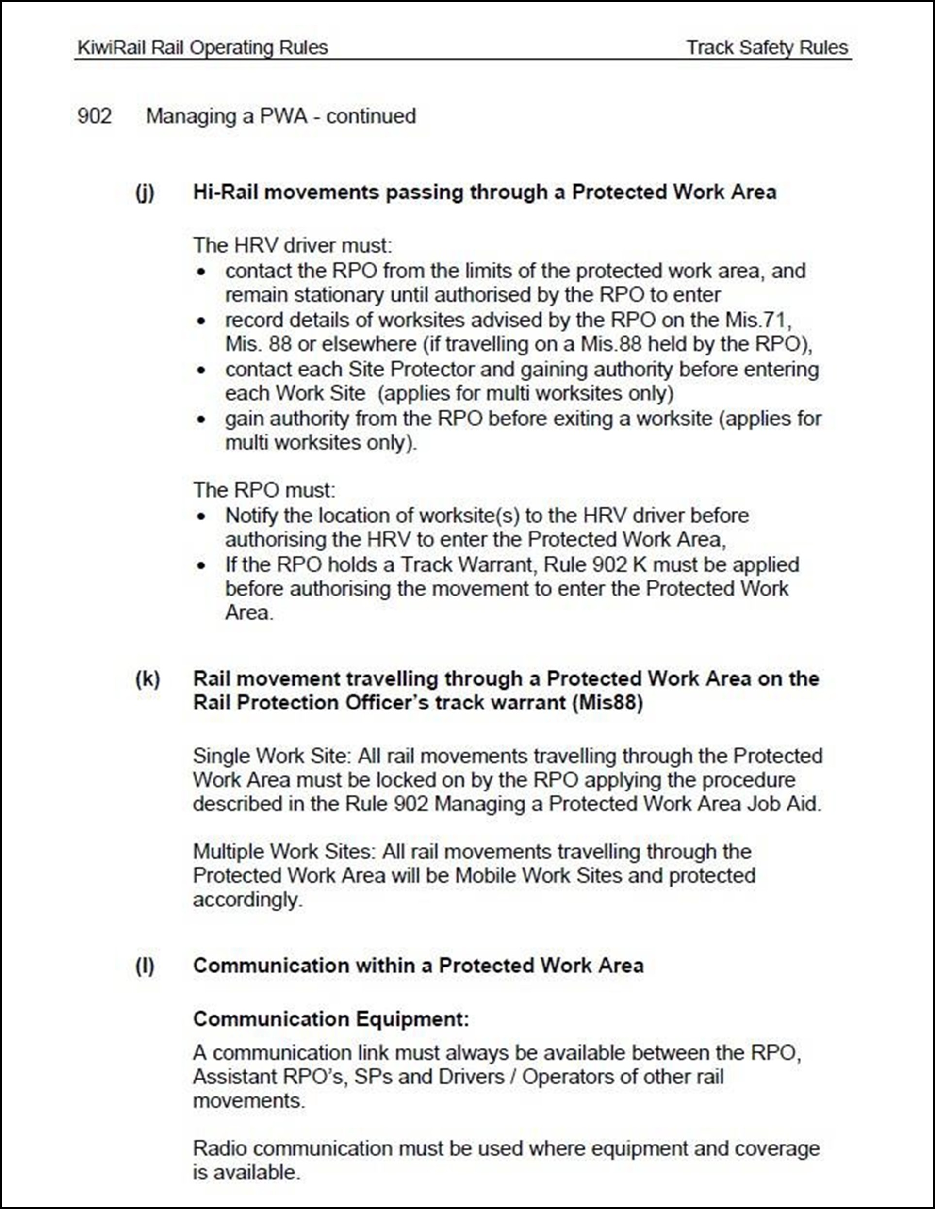 - KiwiRail’s process for authorising rail movements within the project worksite was inadequate for ensuring the safe movement of rail traffic within a protected work area. The requirement for two separate parties to authorise movements when neither had knowledge of the track status likely led to a lower level of oversight as each was expecting the other to have such knowledge.